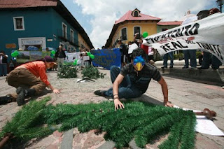 El día comenzaba frió, cielo azul, más nada ni nadie impediría que se realizara la caminata planeada. A las 11:30 a.m. aproximadamente, un grupo de compañeros defensores del bosque partieron del muy conocido “Bosque del Hiloche” en Real del Monte, con mantas, carteles y consignas en pro de la madre naturaleza, caminaron hasta el auditorio casi frente al Instituto de Artes donde otro grupo más los esperaba para unirse a la manifestación, con árboles artificiales de navidad que simularon un bosque andante, globos verdes, personas con máscaras de animales y otras con el rostro pintado a manera de calaveras con collares de billetes (emulación misma del sistema capitalista y los “compradores” de recursos naturales). Así, la fiesta comenzó, ya que entre los gritos y consignas como “El golf quiere agua y al pueblo se le acaba”, “Es un engaño, la tala si hace daño” (siempre rimando), también se oía música de tambores (un grupo de batukeros se unió al contingente), el sonido de un caracol, como si se tratase de un ritual. La caminata en su paso saco de sus casas a los habitantes del Real. Se veían cabezas asintiendo ante las consignas, otras reflejando duda, consternación “es cierto, el agua se acaba”.